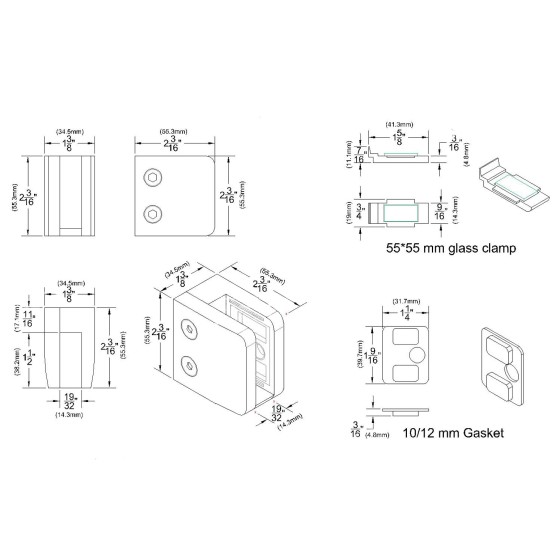 CZP712F, Heavy Duty Square Flat Back Glass Clamp 55 x 55 mm for 3/8″ or 1/2″ Tempered Glass or Laminated Glass