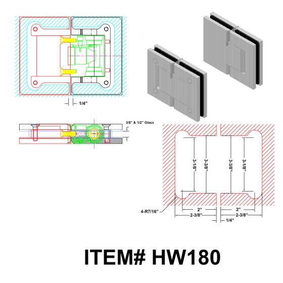 HW180, 180° Glass-to-Glass Hydraulic Hinges Set for 3/8" ~1/2" Glass (1 Spring & 1 Hydraulic)