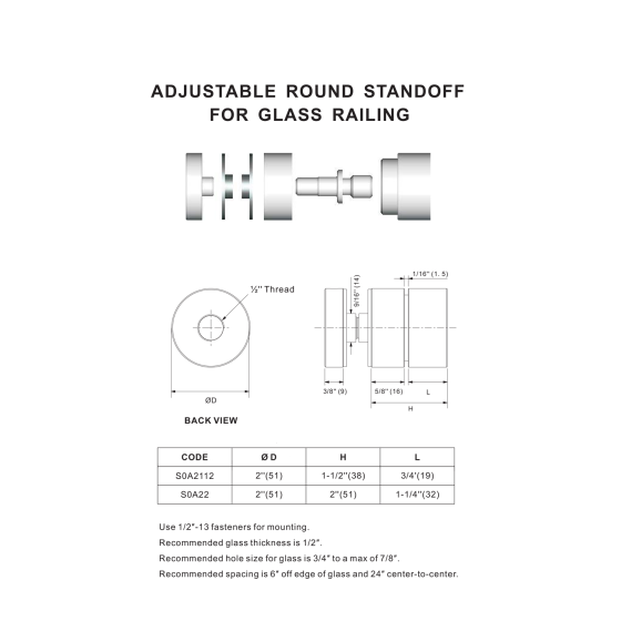 2" Ø Diameter Standoff, Adjustable Round Standoff for Glass Railing, Stainless steel 316